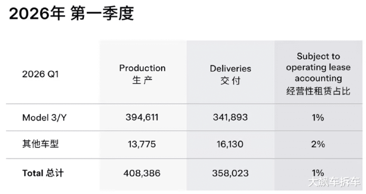 最近,特斯拉公布2026年第一季度全球生产与交付报告,数据显示其一季度全球交付量为358023辆,低于彭博新闻社汇总的分析师平均预期372160辆,这已是特斯拉交付量连续第二个季度未达市场预期。